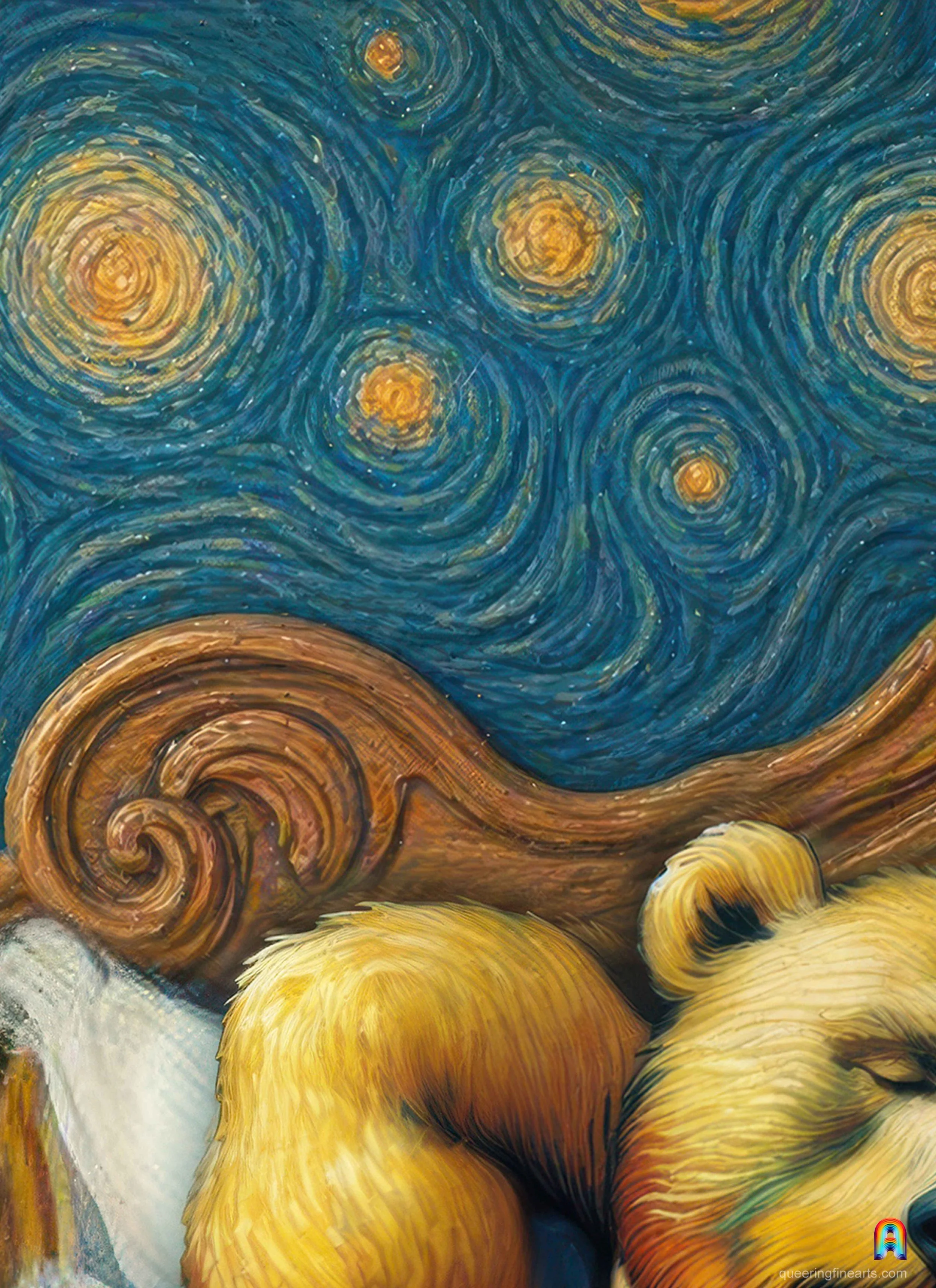 A warm room in the morning, still threaded with the spirals of a starry night¹, as though the sky itself had slipped indoors. An unmade bed. The wood of the headboard, carved with the face of a bear both gentle and watchful, presides over a scene suspended between ancient tale and the nostalgic memory of childhood. Here, the familiar world quietly slips out of alignment: the unexpected visitor has crossed the threshold, entered without a sound, tried each chair, tasted the bowls of porridge², then climbed to the bed where he surrendered himself.