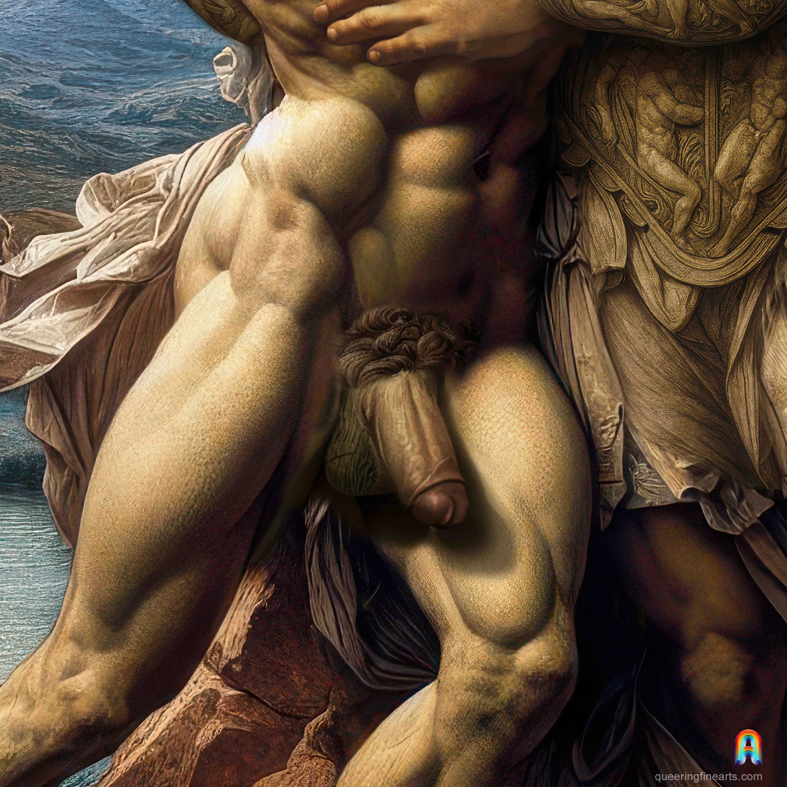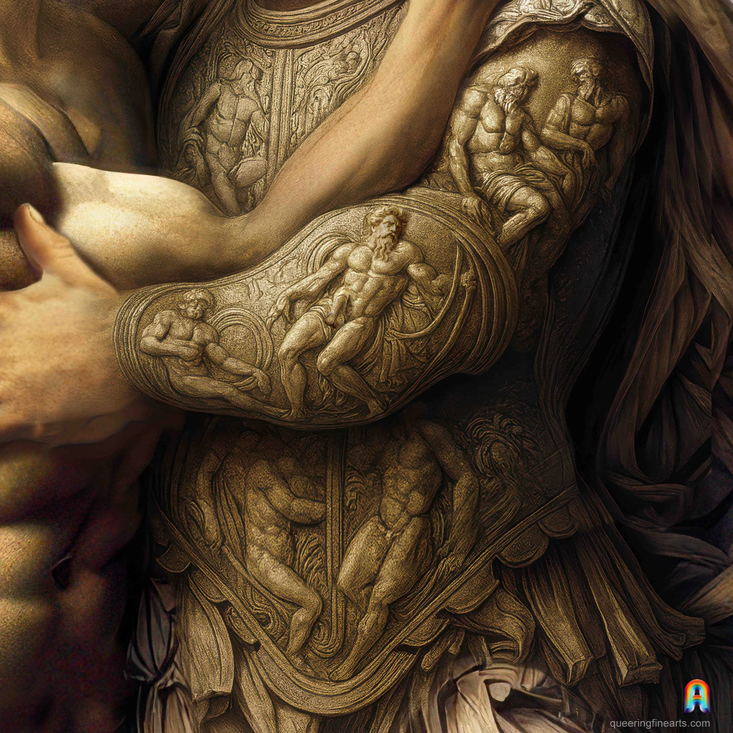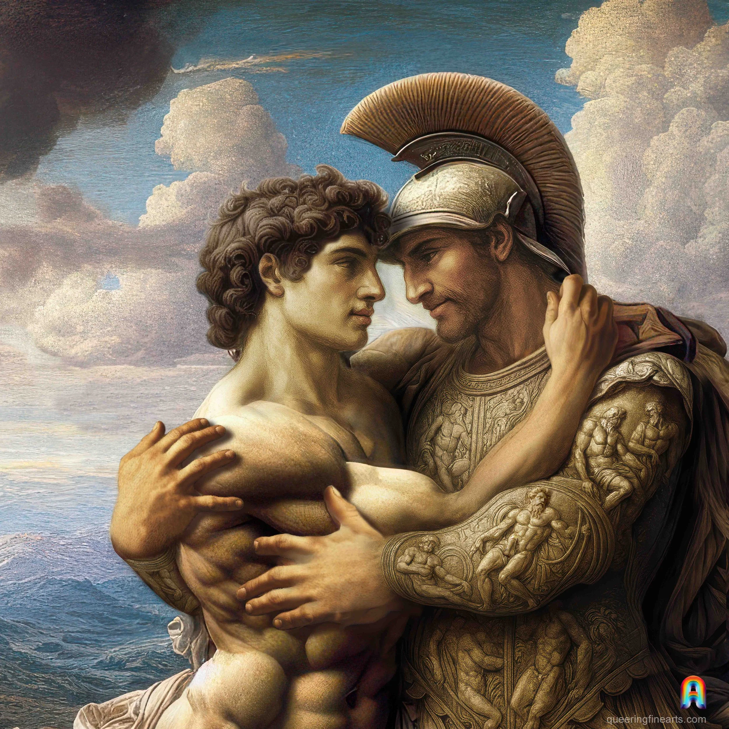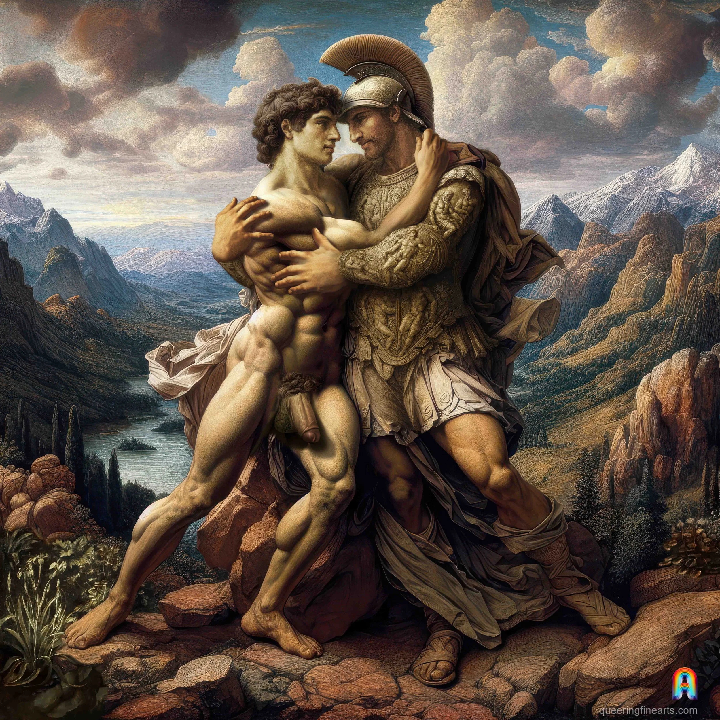 This painting, recently reappeared in a private collection, fascinates as much by its subject as by its uncertain attribution. It shows Epaminondas, the great Theban strategist, armored and helmeted, embracing Cephisodorus, his companion-in-arms and lover, depicted in the fullness of his youth and his nudity. Their bodies, powerful and vibrant, meet in a gesture both heroic and intimate, an interlacing where military glory and carnal tenderness, iron and flesh, action and love converge. The dramatic landscape surrounding them—dark mountains, stormy sky—amplifies the tragic and sensual dimension of the scene.
