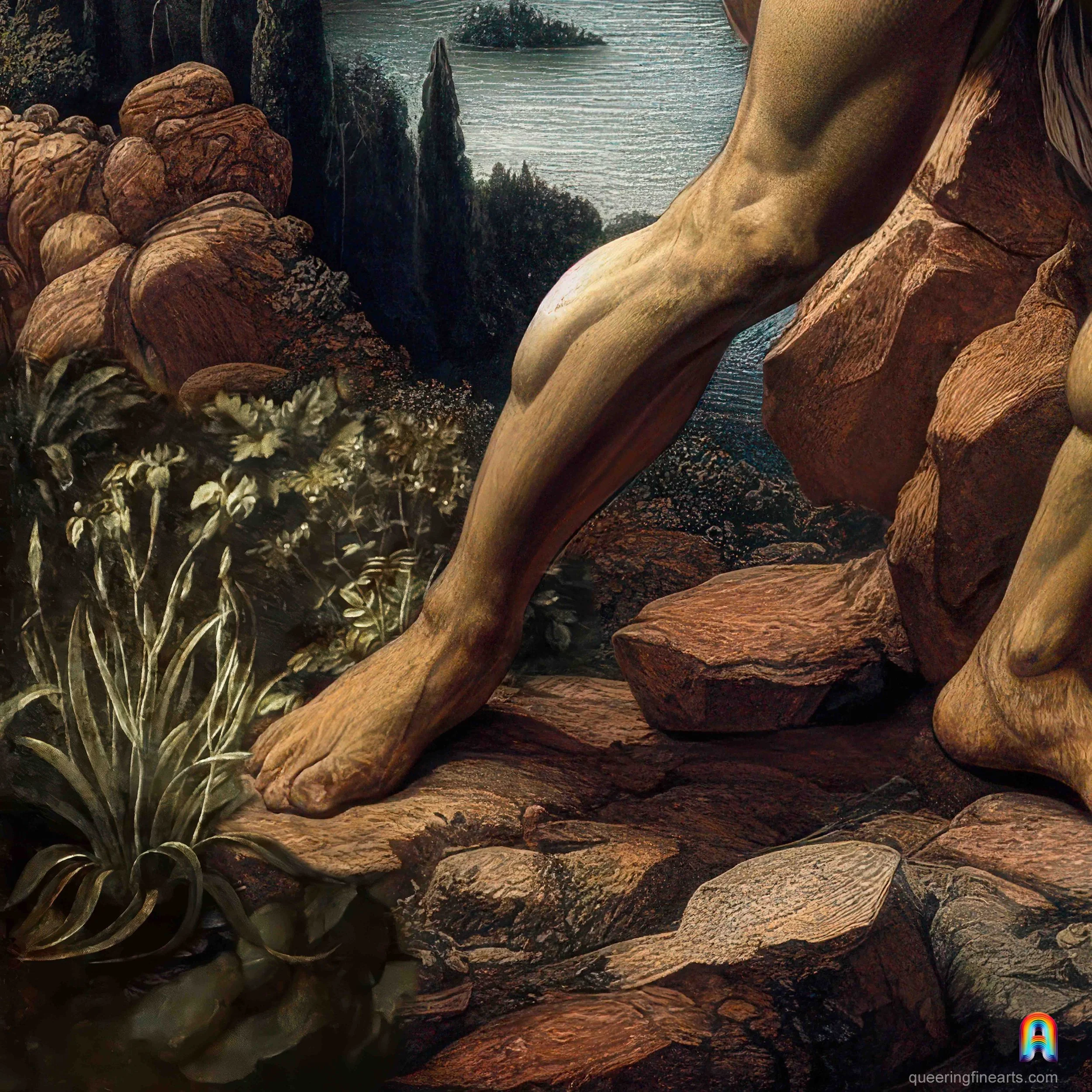 The attribution of the work remains at the center of debate. The anatomical vigor, the monumentality of the postures, and the sculptural modeling of the torsos undeniably evoke Michelangelo: the taut muscles recall the ignudi of the Sistine ceiling or the figures of the Last Judgment. Yet other elements suggest the hand of Leonardo da Vinci: the melancholy softness of Cephisodorus’s face, the sfumato that blurs contours and dissolves flesh into vaporous light, the atmospheric depth of the landscape that envelops the scene in intimate poetry. Where Michelangelo privileges heroic monumentality, Leonardo allows interiority and psychological nuance to emerge.