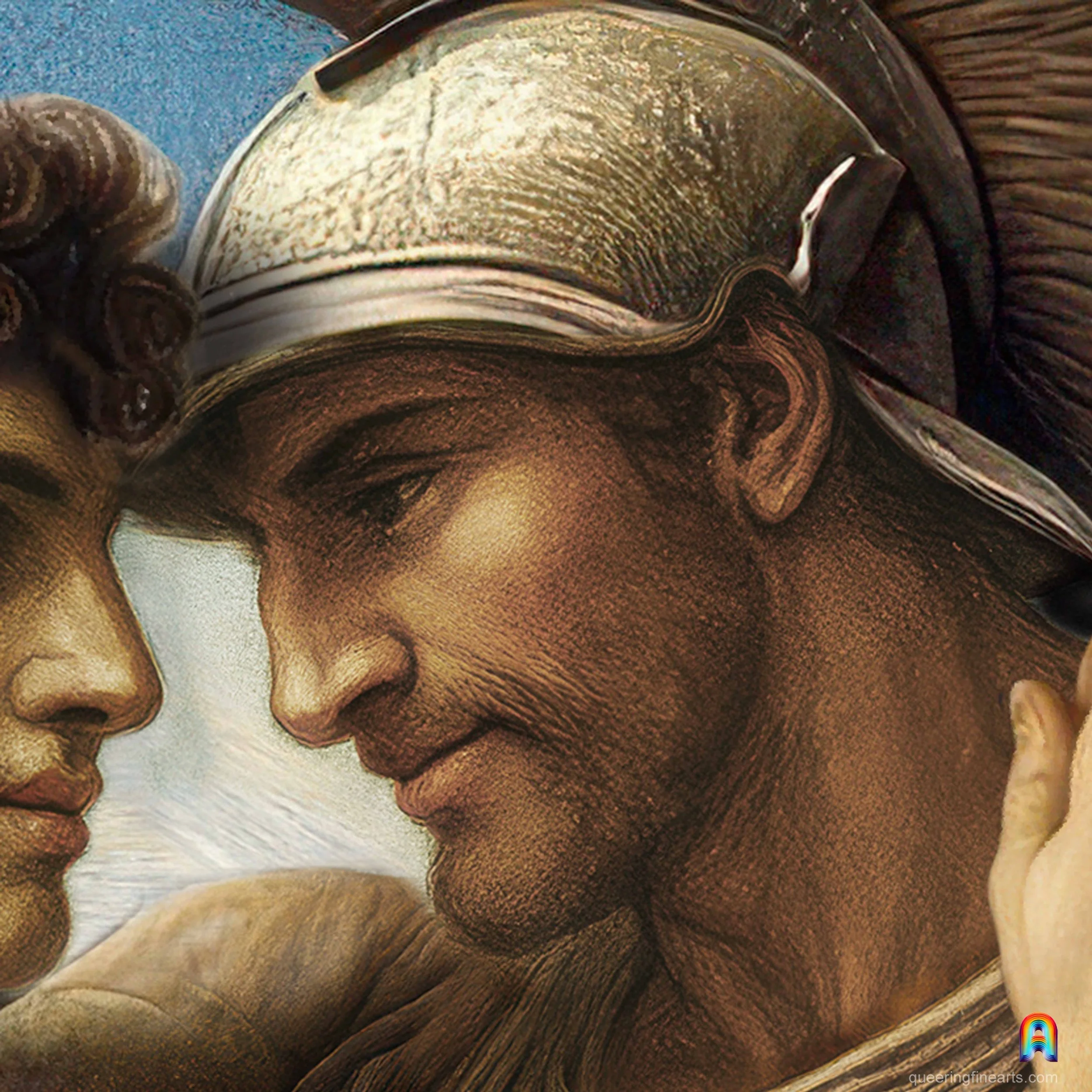 Epaminondas (c. 418–362 BC) is one of the greatest military leaders of ancient Greece. As strategist of Thebes, he broke Spartan power at the Battle of Leuctra (371 BC), overturning the balance of the Greek world. Philosopher as well as general, trained in music and Pythagorean thought, he embodied an ideal of complete humanity. Cephisodorus, younger, was not only his disciple but also his lover: ancient sources explicitly mention their relationship, inscribing it in the Theban tradition of sacred couples. Together, they represented the perfect fusion of military courage and amorous fidelity.