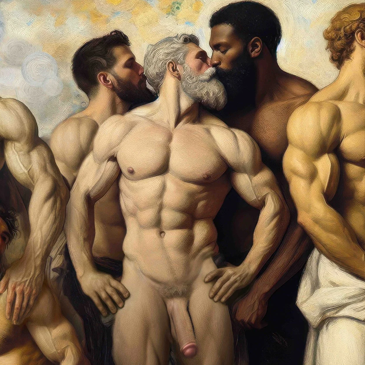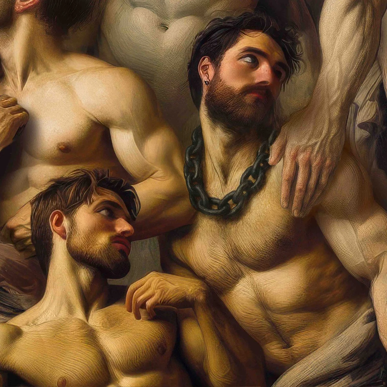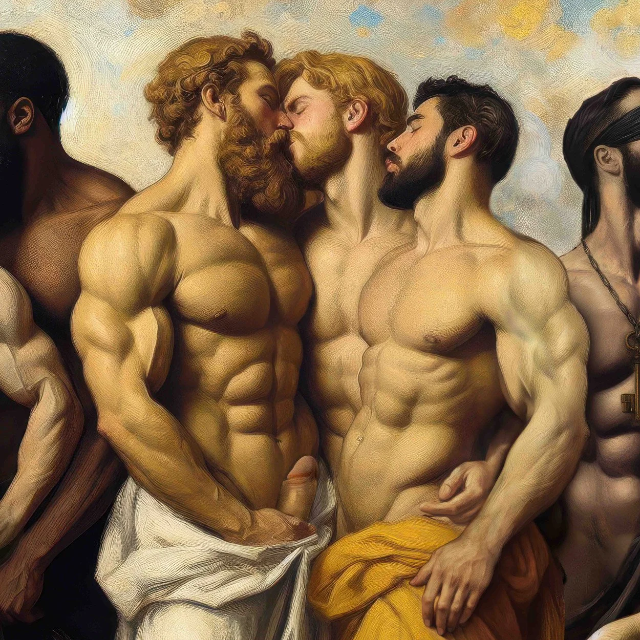 Voluptas Virilis unfolds as a grand allegory of masculine passion, each figure painted with an intensity that transcends time and memory. It is not merely a work of art, but an exploration of the deep, often hidden forces that nourish desire and union. The frieze weaves together the raw sensuality of the male body with timeless themes of power, tenderness, and vulnerability. As the viewer immerses themselves in the piece, they are invited not only to contemplate the beauty of the male form but also to engage in a narrative of emotion, memory, and intimate exchange.
