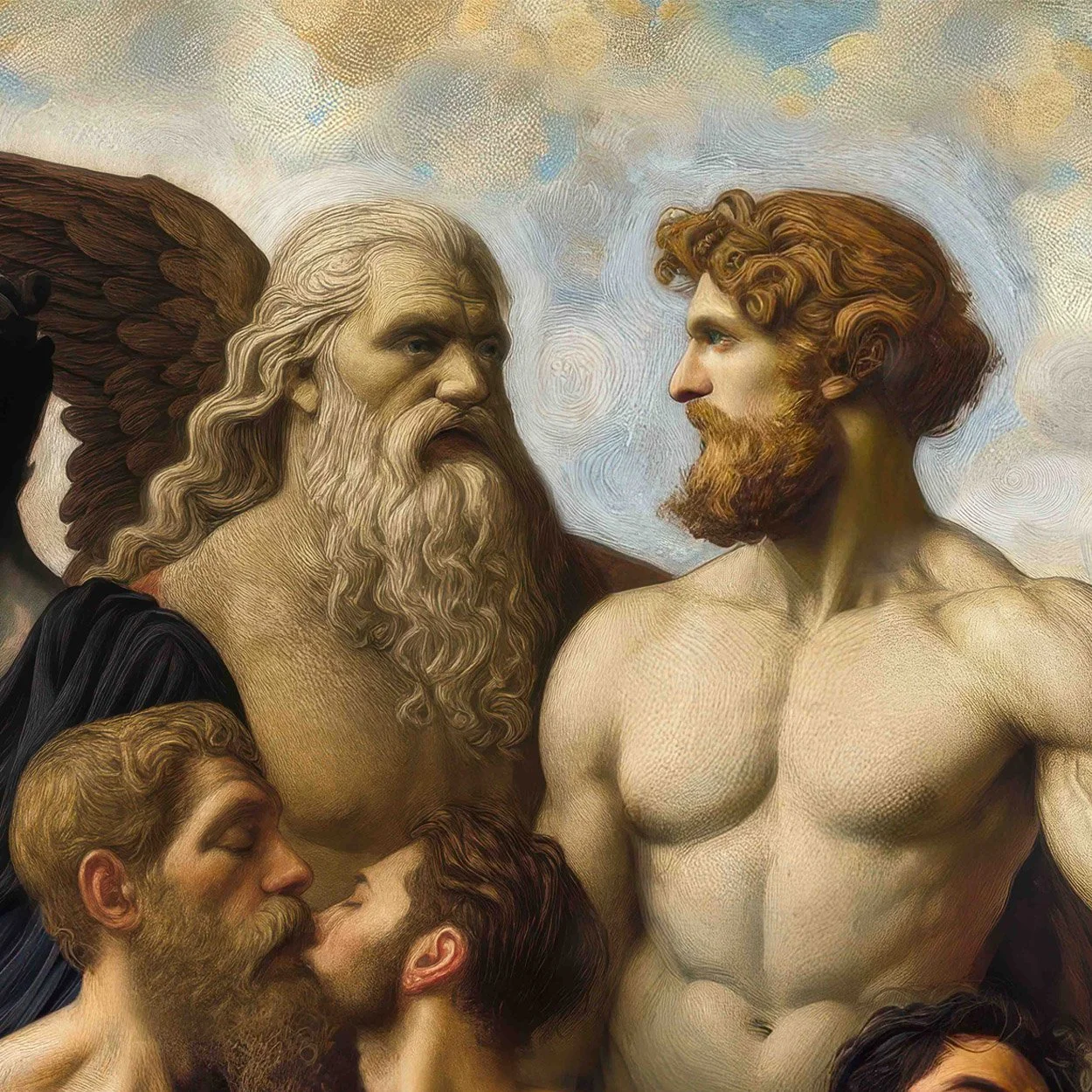 The first, who hides his face in the kiss, is the Oath: the silent promise never to betray the Secret he embraces. His lips, pressed to its cheek, linger in a heated pressure, as if to mark the skin with a burning seal. His quickened breath mingles with the other’s, and the surge of his body conveys a restrained, almost possessive ardor, where desire asserts itself as an irrevocable bond.