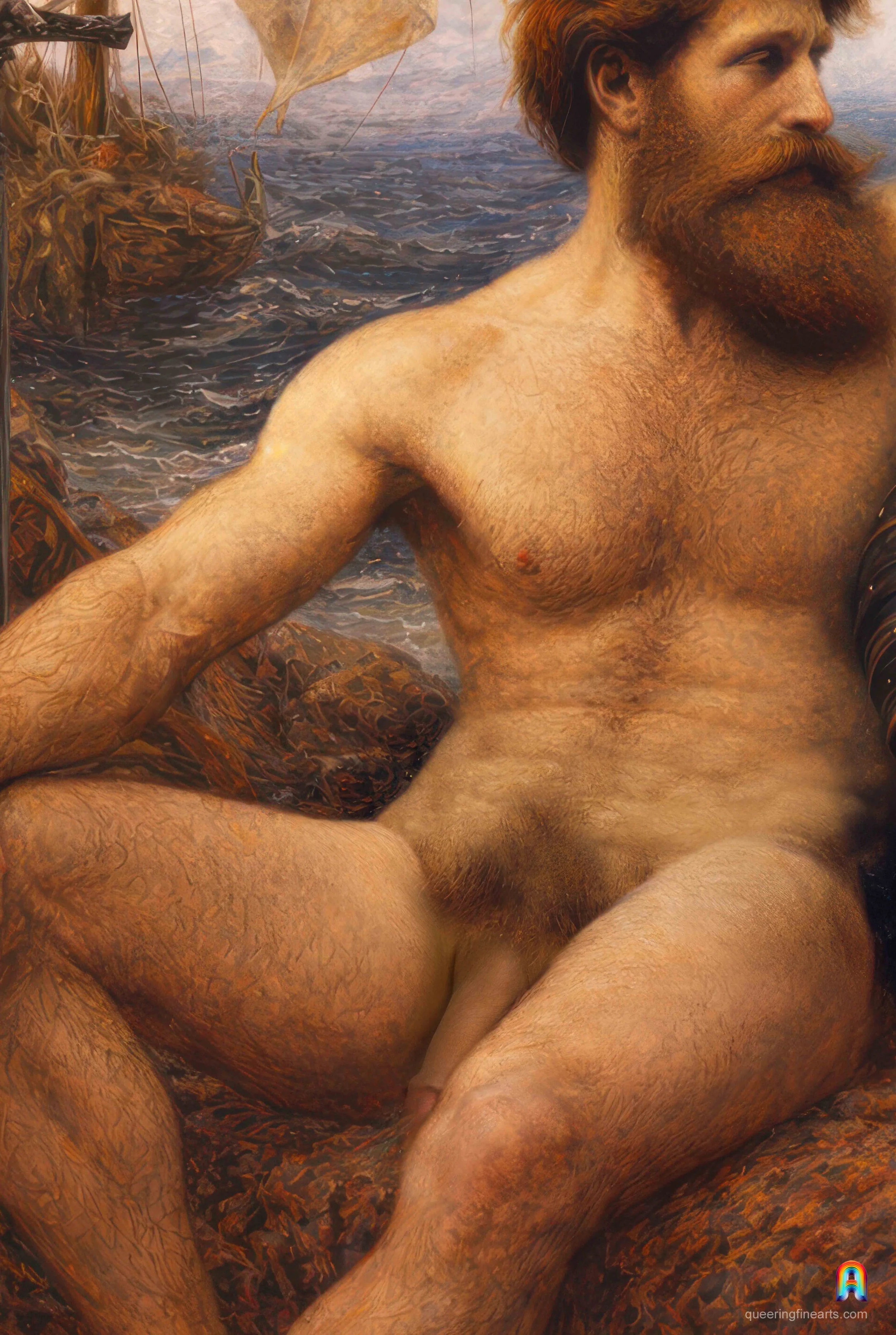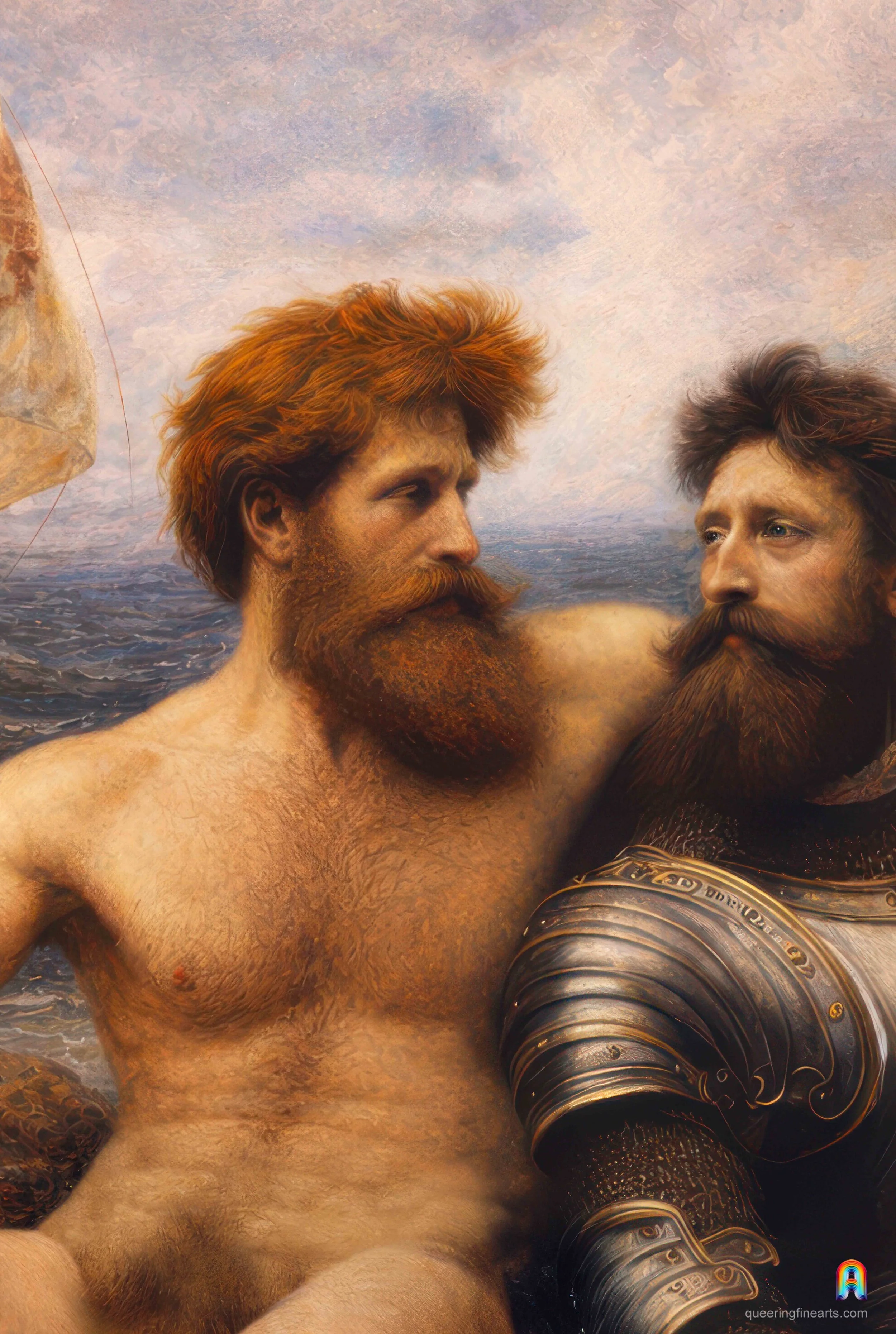 The entire composition clearly belongs to a Pre Raphaelite lineage. The minute precision of textures, the care given to hair and beards, to fabrics and surfaces, together with a rich yet slightly muted palette dominated by ochres, browns, golds, and the grey blues of the sea, recall the pictorial ambitions of the movement⁹. The scene favors a secondary narrative moment, distant from great heroic exploits, in keeping with the Pre-Raphaelite interest in liminal instants, interiorized emotions, and myths reread through affect.