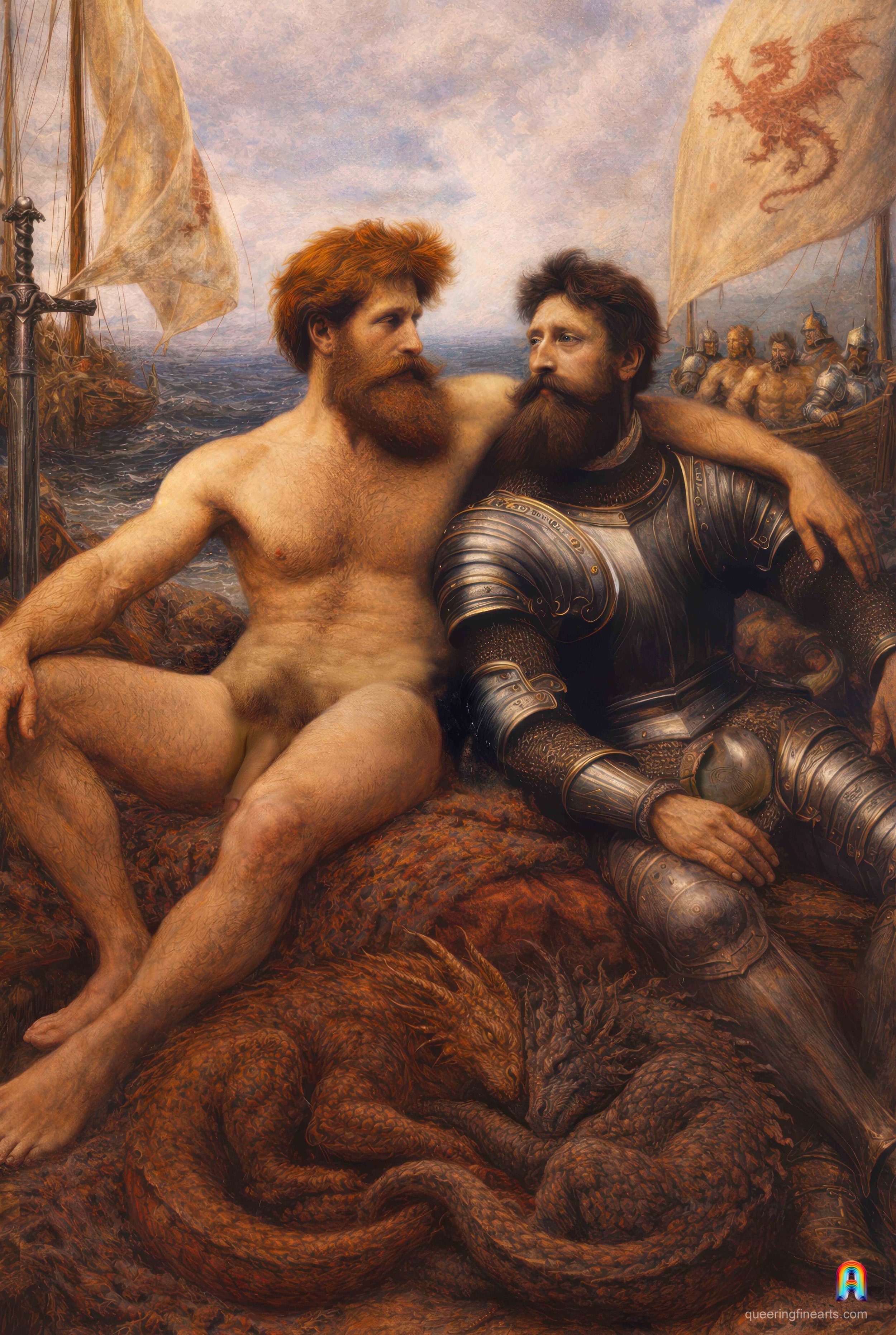 The work Merlin and Uther Pendragon presents itself as a scene of rest and suspended communion, at once intimate and mythological, in which the Arthurian matter is reread through a freer symbolic and affective lens¹. Two male figures occupy the center of the composition, seated side by side within a vessel moving upon the sea². Their bodies form an almost circular axis, reinforced by Merlin’s bare arm laid around Uther’s shoulders, a gesture of protection, closeness, and chosen bond, reaching far beyond mere warriorly companionship³.