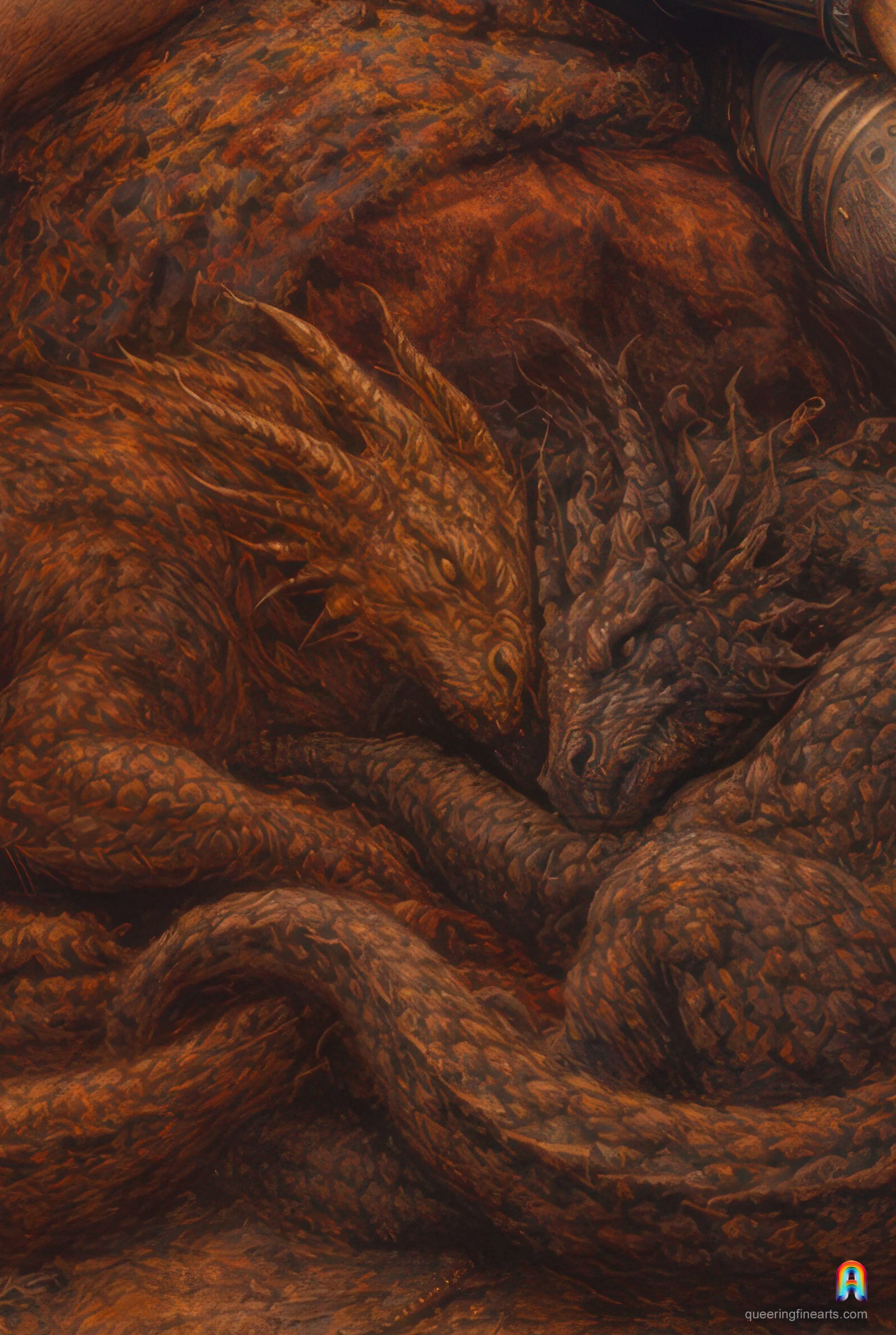 Merlin, wholly unclothed, embodies a primordial nature, anterior to the codes of chivalry and political power⁴. His nakedness belongs to an organic presence, rooted in the flesh and in the sensible world. It calls forth the figure of the wild prophet, the mage bound to ancient forces, to water and air and the deep powers of the earth. His russet beard and tawny hair echo the warm tones of the dragon slumbering at his feet, creating a visual and symbolic continuity between man, mythic beast, and the elements themselves⁵.