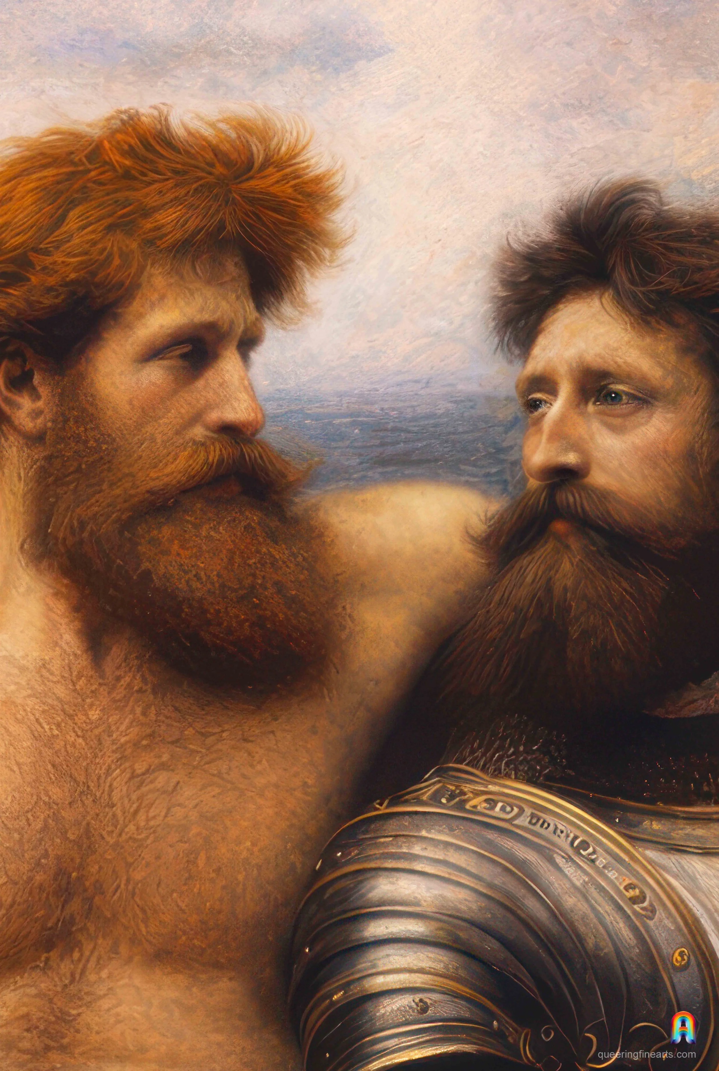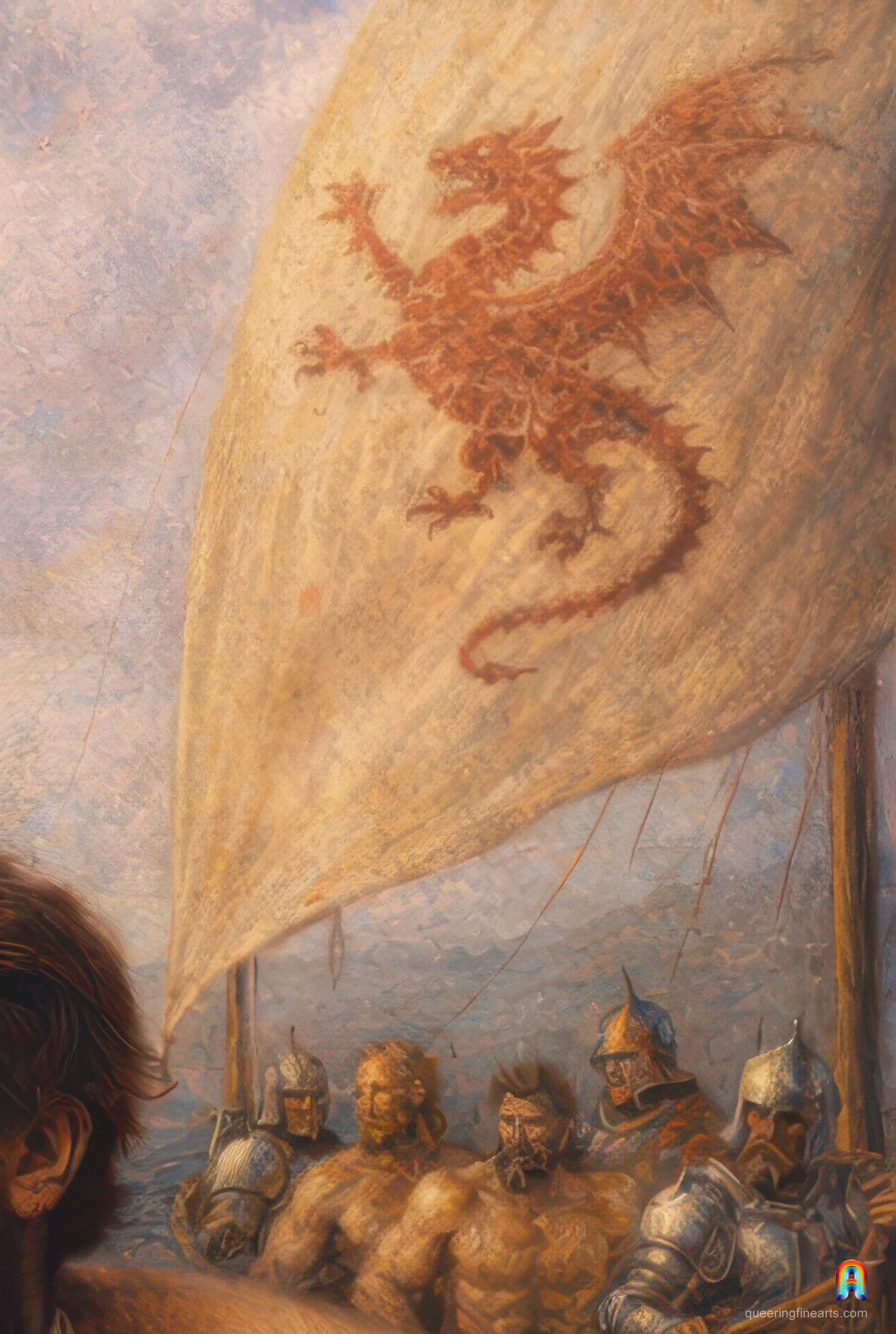 In the background, the troubled sea and the ships whose sails bear dragons set the scene within a moment of transition. The world is in transformation, warlike forces gather, while time itself seems suspended around the two men. The fighters visible in the other vessels dissolve into a semi-darkness that hints at a story. Their presence structures the background without drawing attention away. The true dramatic center lies in the unequal exchange of gazes between Merlin and Uther. Merlin fixes Uther with a dense and almost questioning attention, while Uther turns his gaze aside and drifts pensively into the distance, absorbed by an inner horizon still unformed.
