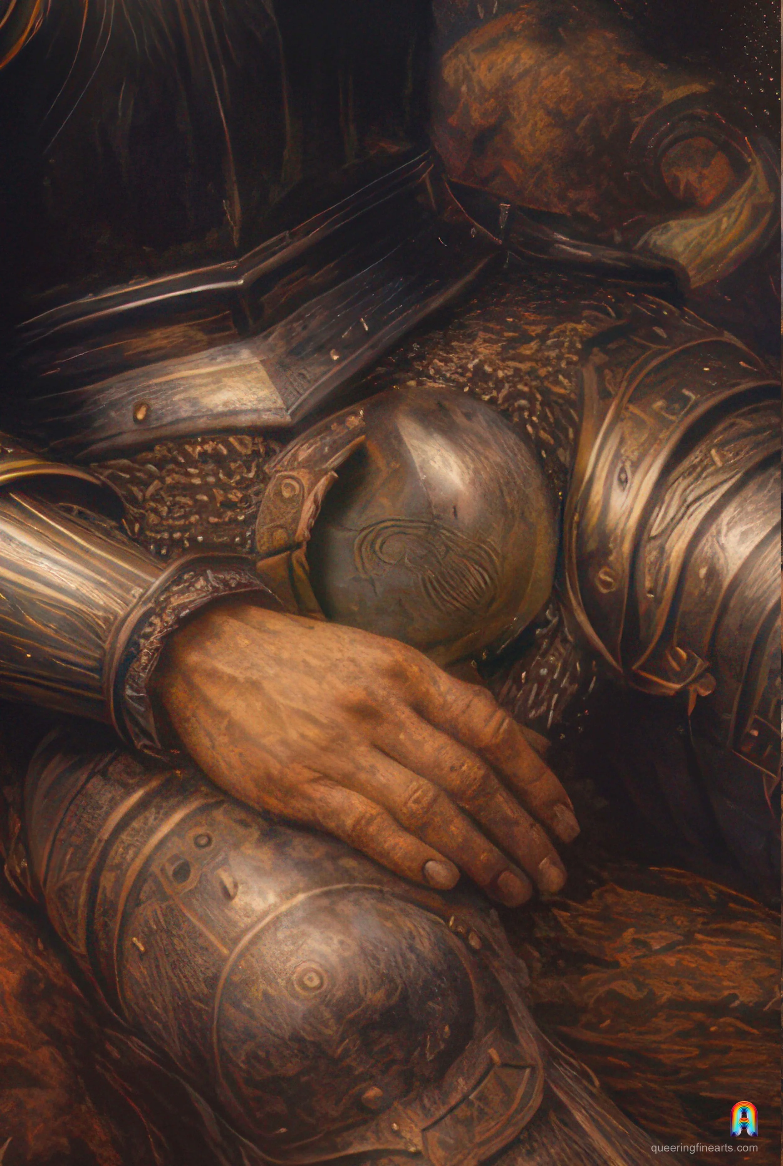 Uther Pendragon, by contrast, appears clad in full armor⁶. The polished metal, richly wrought, gathers the light and proclaims his belonging to the realms of power, war, and kingship yet to come. This armor enters into dialogue with Merlin’s naked body and is inscribed within a relation of balance. It acts as a second skin, rendered gentle by the nearness of the mage. The contrast between nakedness and armor becomes an accepted complementarity. Merlin embodies the unseen source of power, while Uther represents its earthly and political expression.
