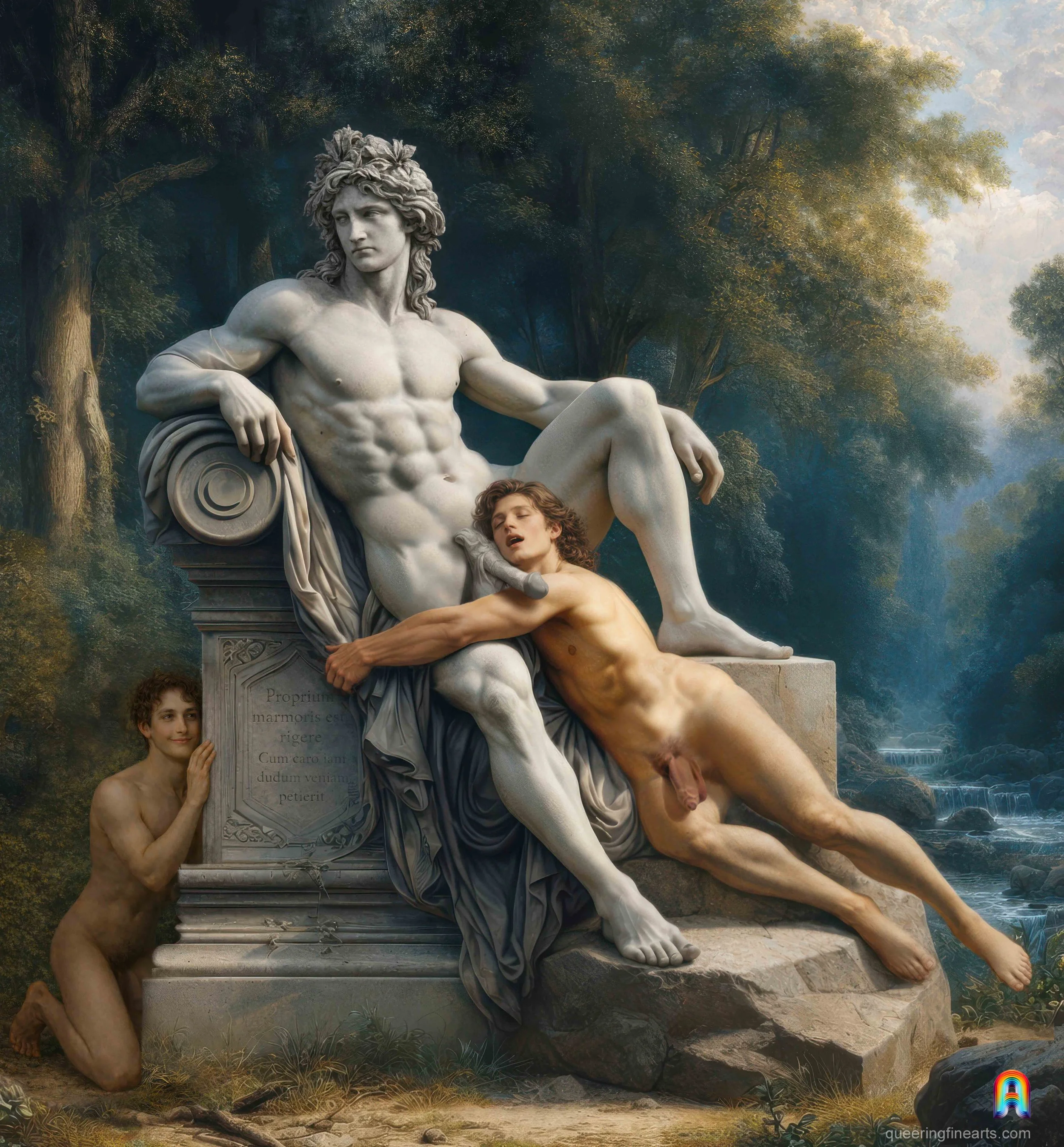 The implicit narrative unfolds within this asymmetry. Valerius regularly enters the sacred grove to render thanks to Apollo. Acer, rebuffed in his advances, suspects a rival. Following Valerius, he discovers that the rival is none other than an image of stone. Jealousy gives way to fascination: the object of desire is not another man but the ideal itself, whose oversized virile member becomes its embodiment⁹.