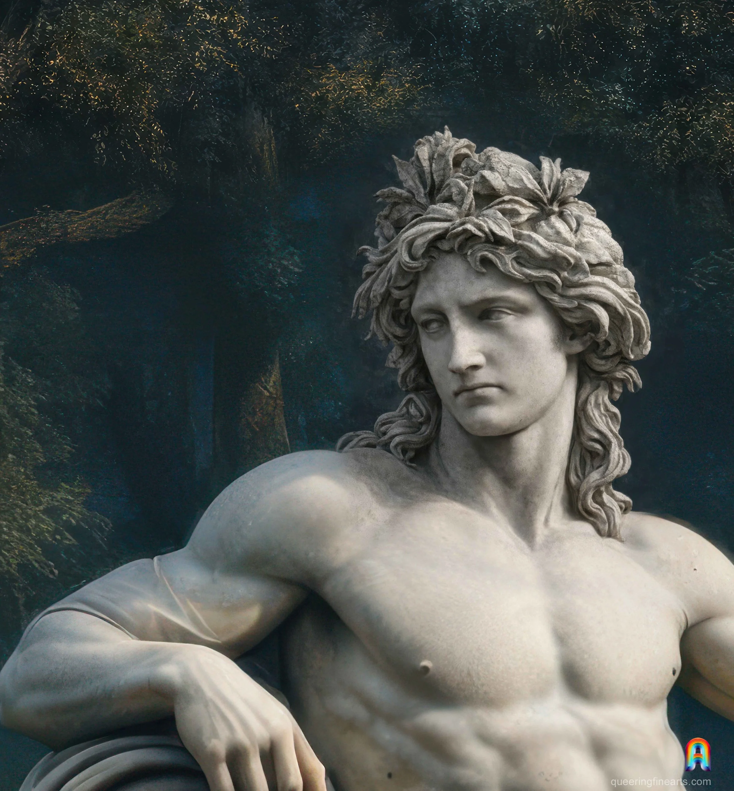 At his feet, a nude youth, Valerius, yields against the god’s thigh in a gesture of fervent embrace. His warm body, modeled in amber tones, stands in vivid contrast to Apollo’s mineral whiteness. The golden light filtering through the foliage heightens this opposition between vibrant flesh and immutable stone³. Valerius’ posture, head thrown back, eyes closed, expresses an erotic ecstasy doubled by an almost mystical fervor.