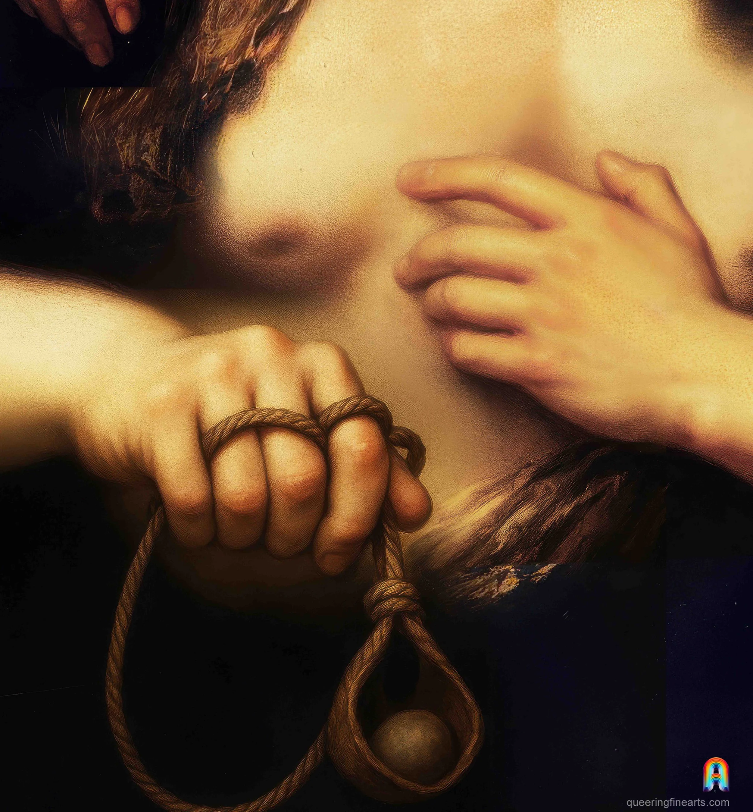 Their faces incline toward each other, a hand rests upon a chest, and the golden light enveloping their bodies conveys a solemn intimacy. Through the chiaroscuro, the vigor of the modeling, and the contained sensuality of the gesture, the work belongs to the spiritual and carnal tradition of the Utrecht school.¹