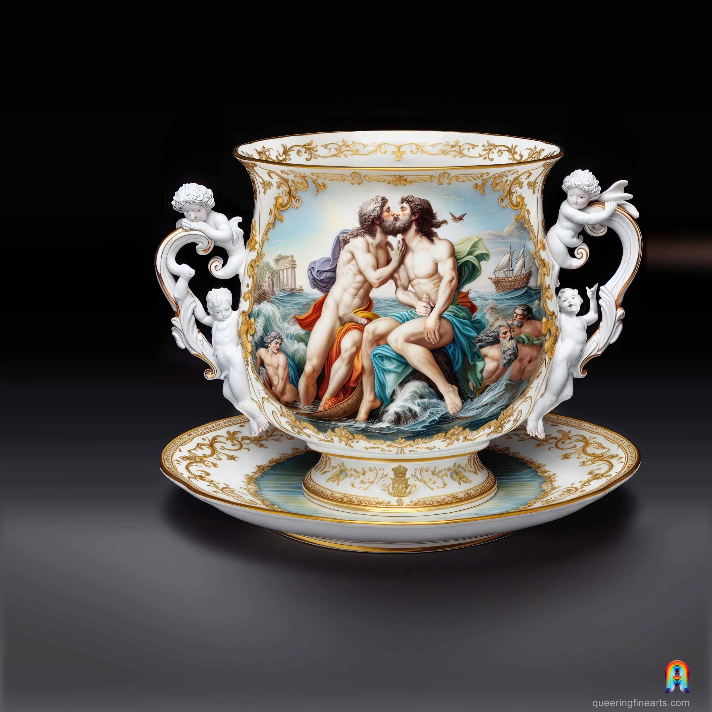 This iconography addresses its patron, whose identity will be revealed later, through a fully mastered humanist erotic language, bringing together Nerites and Glaucus for poetic and symbolic purposes. The choice of these secondary figures from the marine pantheon allows for the assertion of a clear and learned form of divine homosexuality. Metamorphosis, central to their myths, structures the scene as an active principle of desire. The technical mastery of Viennese porcelain, evident in the clarity of the flesh tones, the precision of the draperies, and the controlled stylization of the sea, supports this reading without excess⁵. Conceived for a select table setting, the cup transforms conviviality into a visible and sovereign assertion of love between men, inscribed within the mythological order and fully embraced as such. One can easily imagine that this beautiful object invited two people to drink from it together, complicit in a shared intimacy, where the contact of two lovers’ lips could silently extend the painted scene.